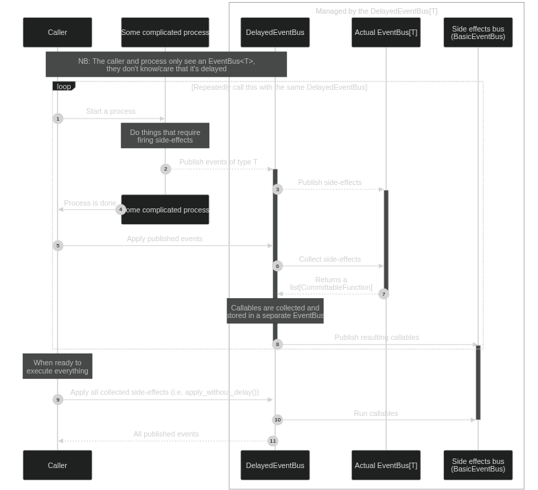 Instead, every time 'apply' is called on a DelayedEventBus, the underlying event bus is collected, and we add the would-be executed Callables to a separate event bus.